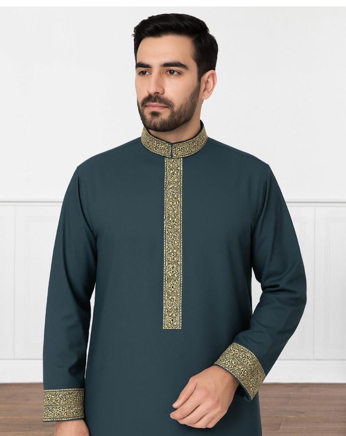 - Imported Spun Fabric- High Quality Fabric- Finest Quality Stitch- 2 Side Pockets- Quality Based on International AQL- Sea Green Embroiderd Saudi Thobe