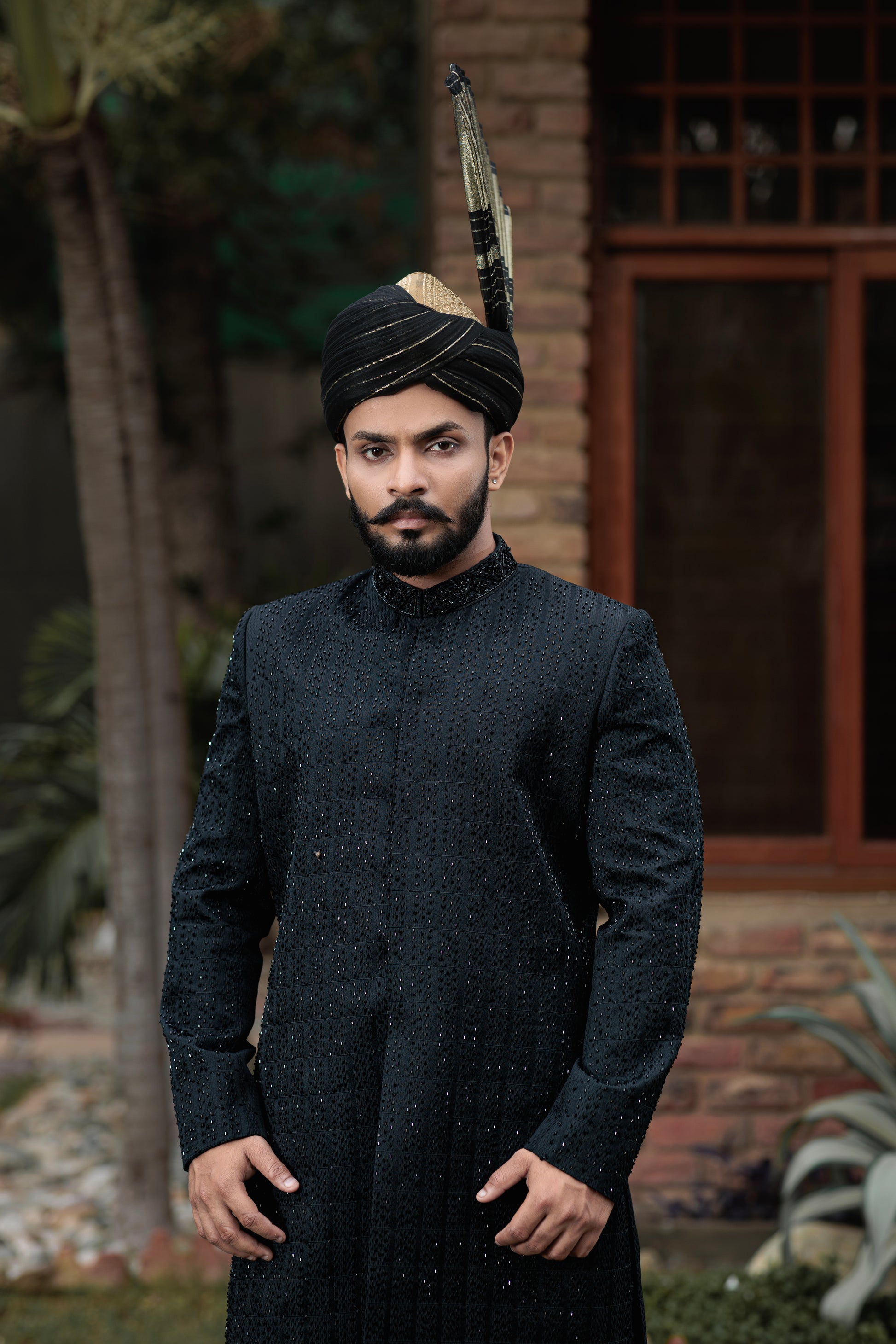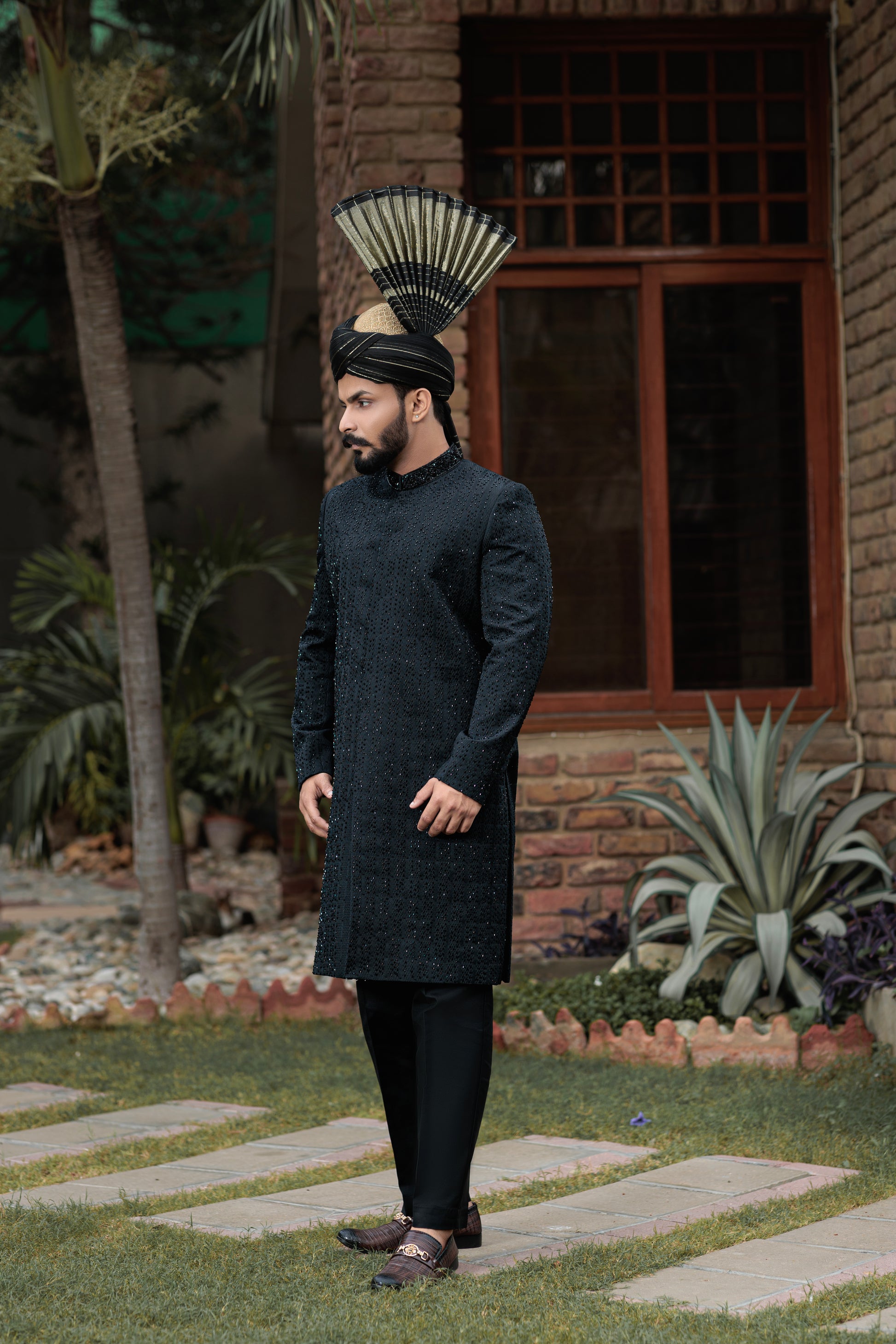 Celebrate timeless tradition with our Sherwani, a perfect fusion of classic heritage and modern style. Designed for weddings, formal gatherings, or festive events, this outfit exudes luxury and elegance.This ultimate groom’s sherwani comes single pc also along a 4-piece set (sherwani, turban, inner set and khussas).Perfect for weddings or festive occasions, this sherwani exudes sophistication Royal Charm and extraordinary elegance