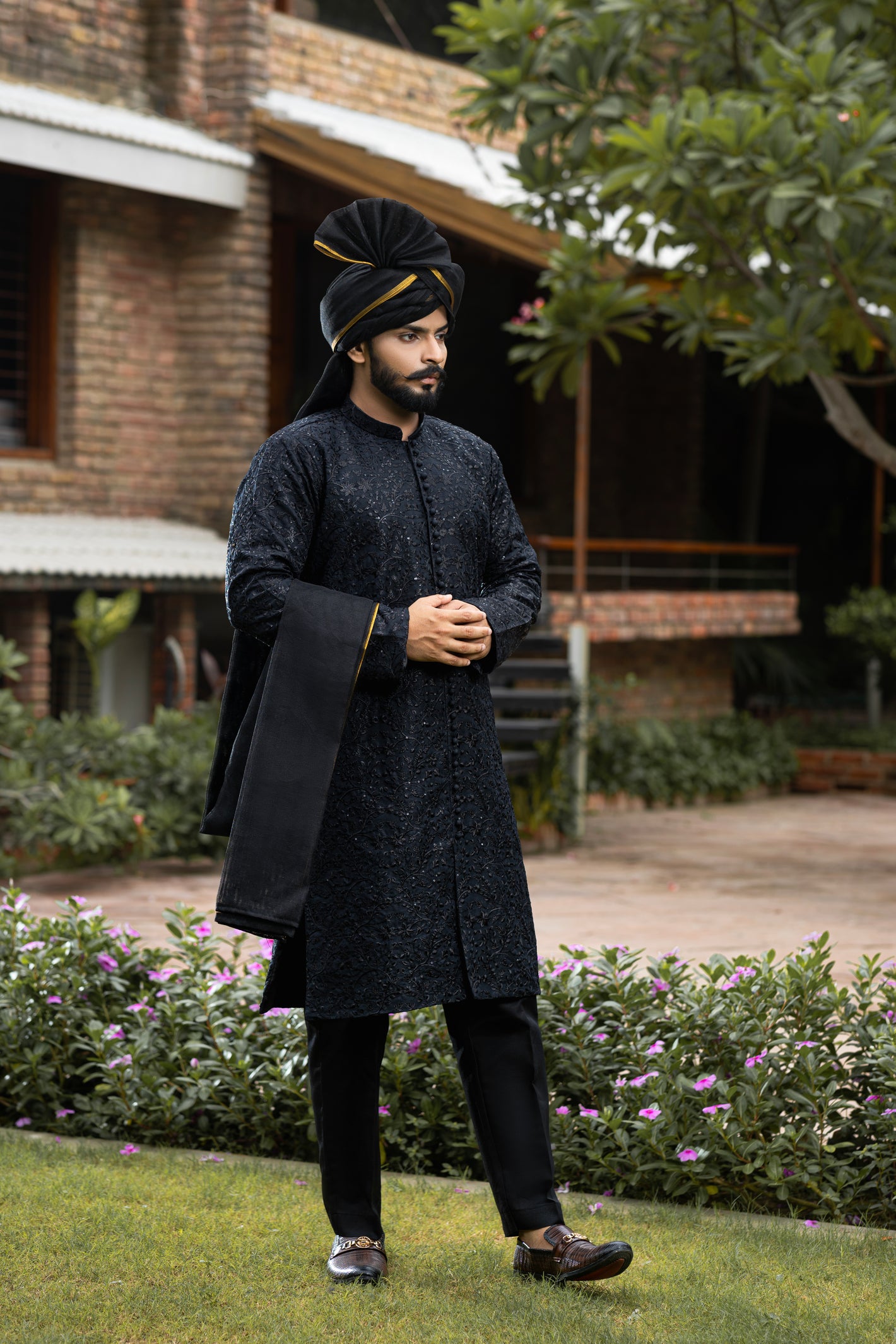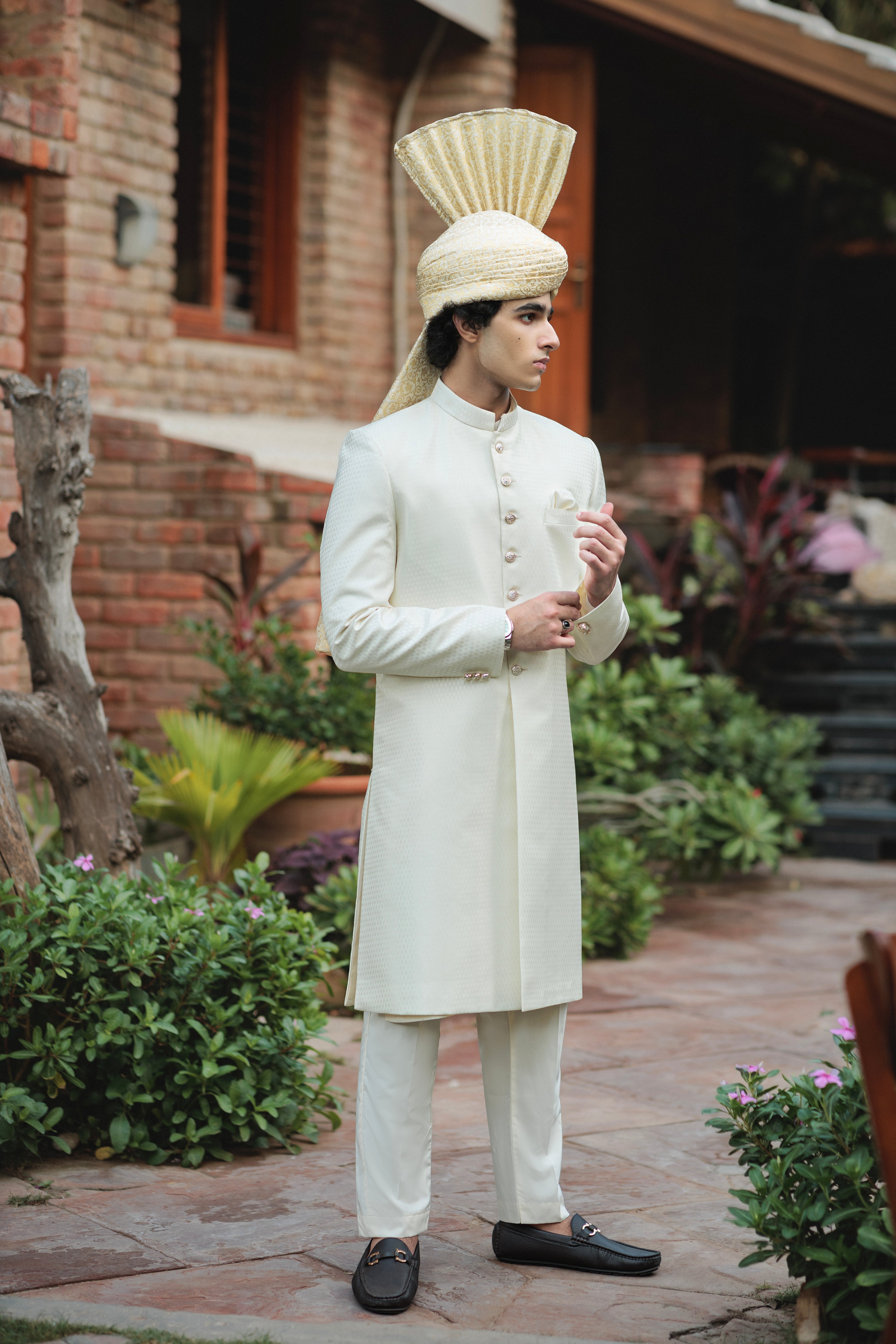 Celebrate timeless tradition with our Sherwani, a perfect fusion of classic heritage and modern style. Designed for weddings, formal gatherings, or festive events, this outfit exudes luxury and elegance.This ultimate groom’s sherwani comes single pc also along a 4-piece set (sherwani, turban, inner set and khussas).Perfect for weddings or festive occasions, this sherwani exudes sophistication Royal Charm and extraordinary elegance.