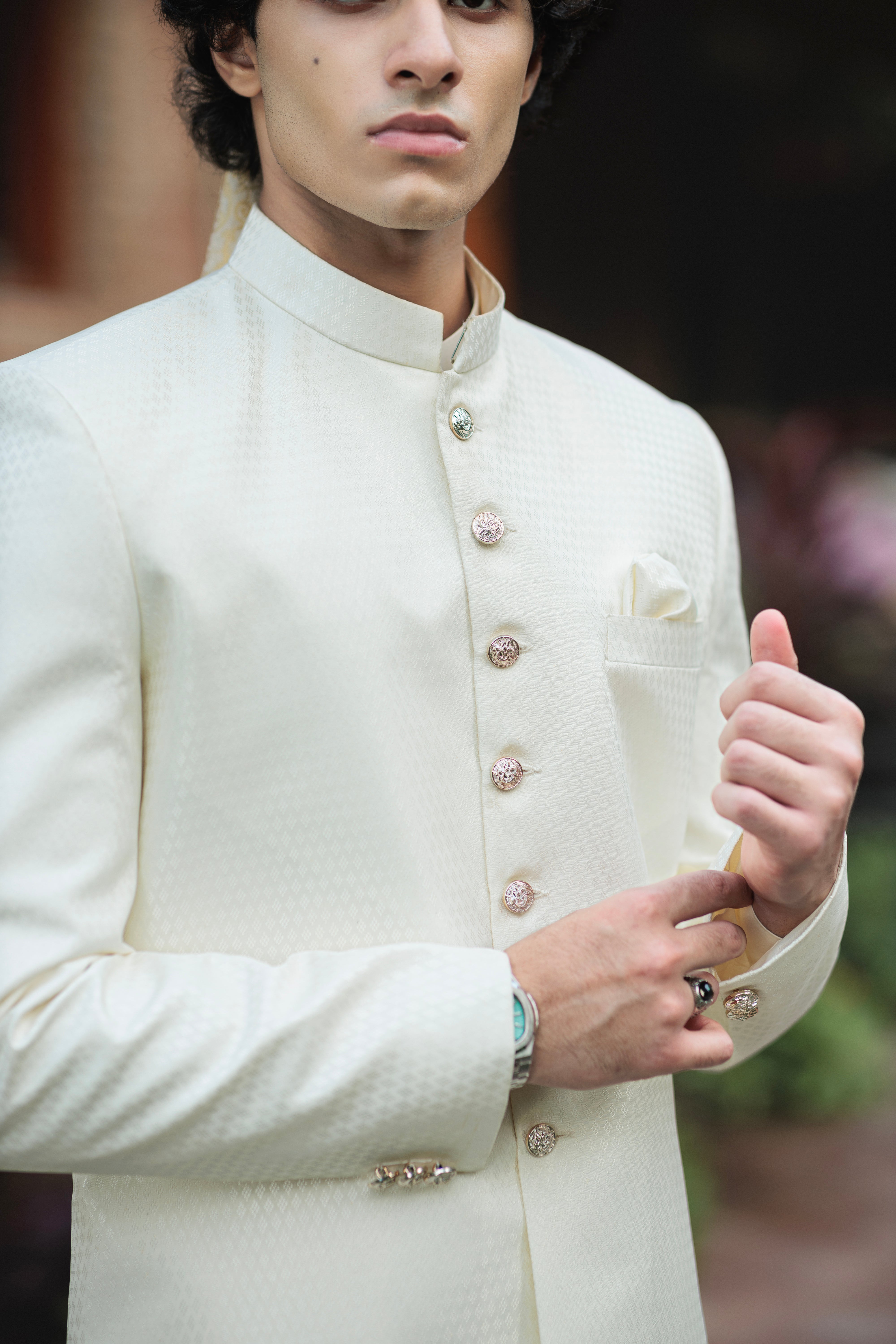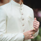 CREAM SHERWANI JACKARD SELF PLAIN