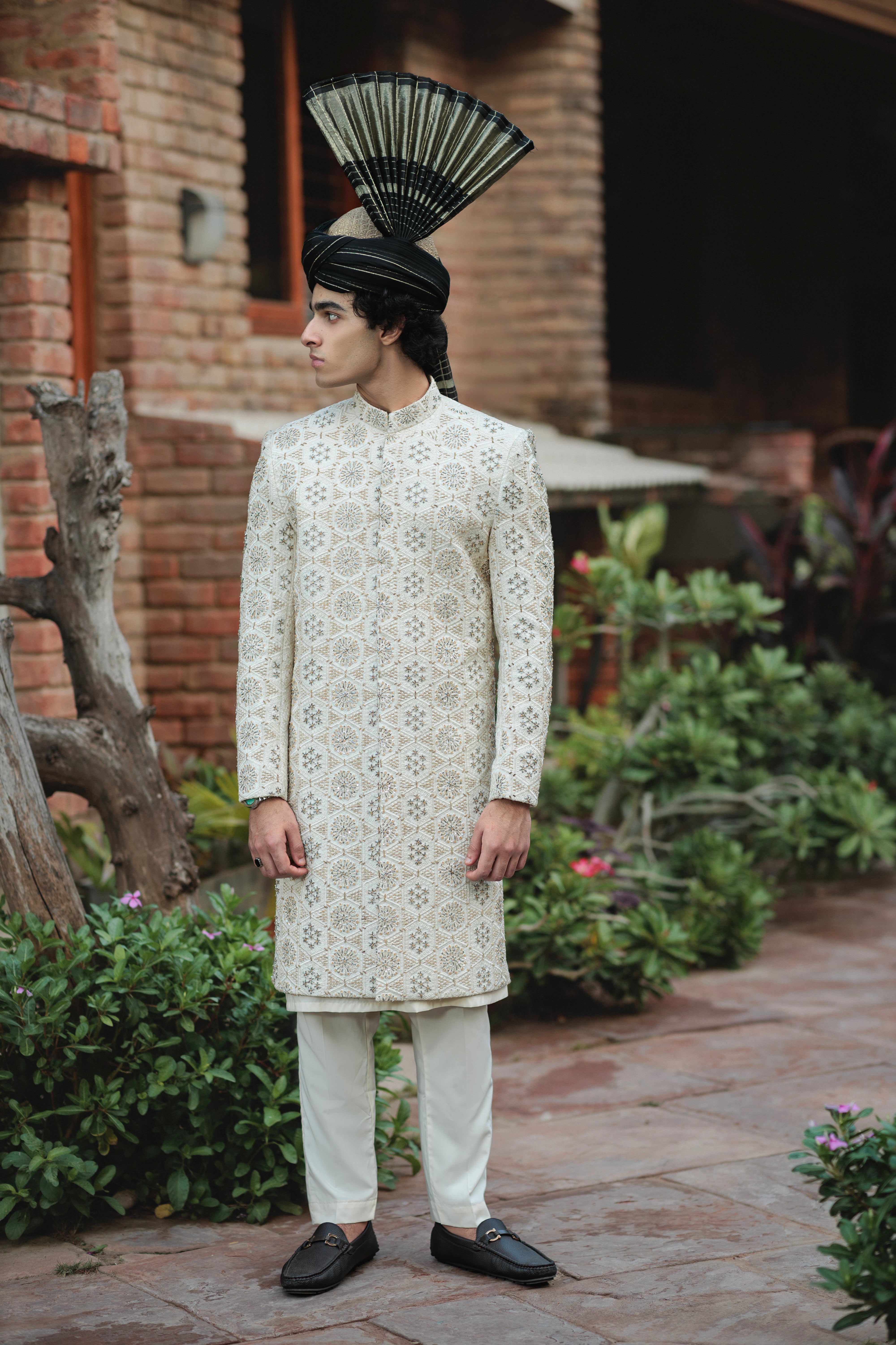 Celebrate timeless tradition with our Sherwani, a perfect fusion of classic heritage and modern style. Designed for weddings, formal gatherings, or festive events, this outfit exudes luxury and elegance.This ultimate groom’s sherwani comes single pc also along a 4-piece set (sherwani, turban, inner set and khussas).Perfect for weddings or festive occasions, this sherwani exudes sophistication Royal Charm and extraordinary elegance.
