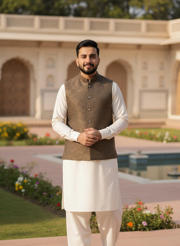 Add class to your traditional Shalwar suit with this modern and elegant men waistcoat. Made from a soft and lightweight tropical fabric it is processed using the latest techniques to get a smooth and clean texture. This men waistcoat is a luxurious complement to a suave personality. Order now to stand out from the crowd.