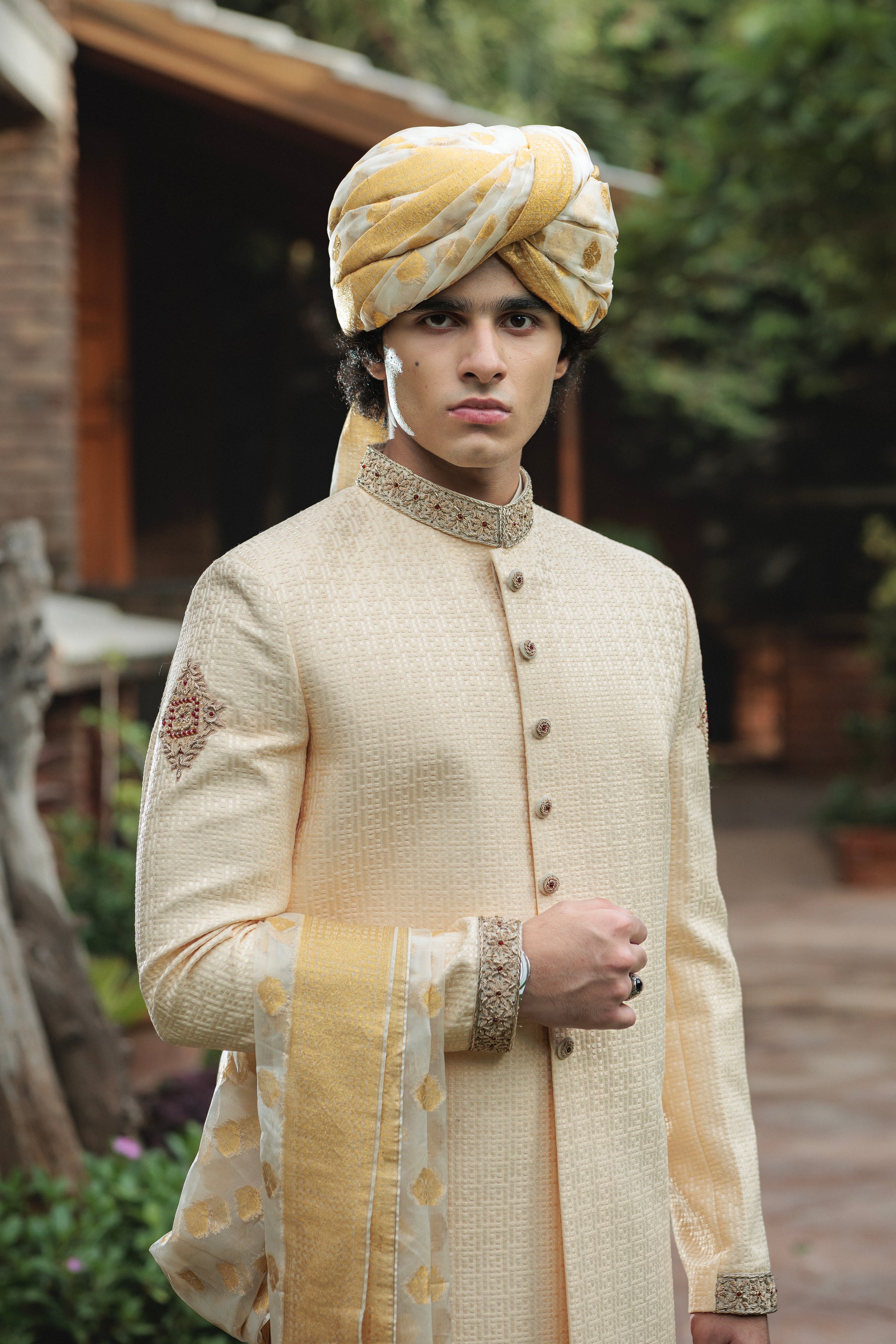Celebrate timeless tradition with our Sherwani, a perfect fusion of classic heritage and modern style. Designed for weddings, formal gatherings, or festive events, this outfit exudes luxury and elegance.This ultimate groom’s sherwani comes single pc also along a 4-piece set (sherwani, turban, inner set and khussas).Perfect for weddings or festive occasions, this sherwani exudes sophistication Royal Charm and extraordinary elegance.